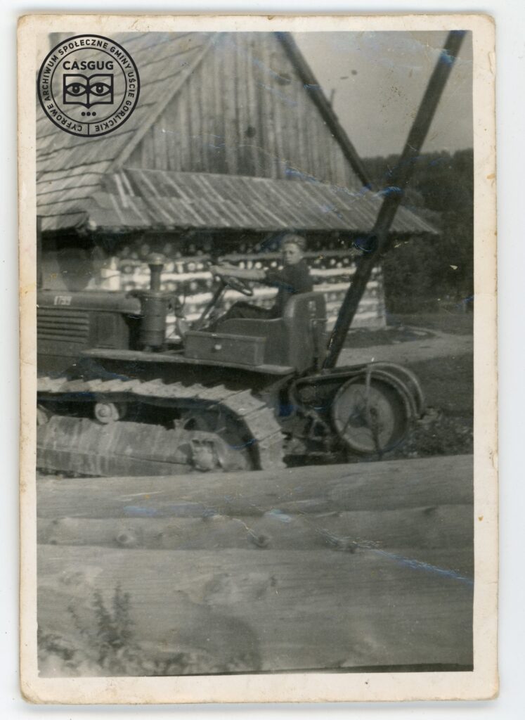 Oto ona. Chyża z Smerekowca Salomei Gromali sfotografowana przez nieznanego autora w latach 50 XX ; na maszynie widzimy Józefa Ludwina. Fotografia z kolekcji Grażyny Cycoń (CASGUG PL_1061_CASGUG_049_001_004).